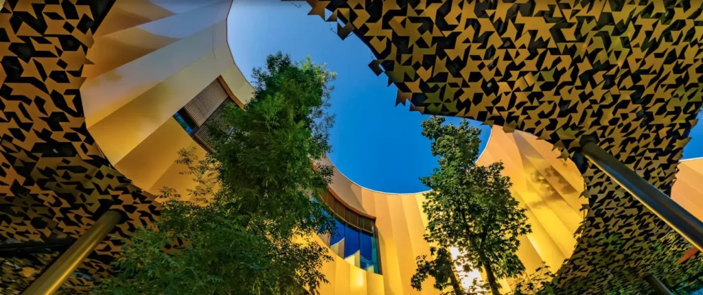 La House of Music, inaugurée en 2022 à Budapest, en Hongrie, est un projet de rénovation urbaine ambitieux qui donne un nouveau visage à la capitale hongroise. L’architecte japonais Sou Fujimoto* l’a imaginée comme « une onde sonore suspendue à la cime des arbres ». Bâti et environnement paysager s’entremêlent dans une osmose parfaite, malgré les 9 000 m² de ce bâtiment exemplaire en matière de transition énergétique, via la géothermie et l’utilisation de matériaux durables. Les frontières entre intérieur et extérieur s’estompent grâce à d’immenses panneaux de verre thermique à contrôle solaire, qui composent un véritable rideau translucide.